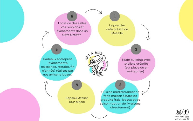 Chez Art à Miss, tout est pensé pour vous offrir des expériences uniques : un espace créatif, des ateliers inspirants, une cuisine savoureuse et des cadeaux faits main. Que vous soyez une entreprise, une association, un club ou un groupe d’amis, vous trouverez ici un lieu à votre image. Bienvenue dans un univers où chaque instant devient une œuvre d’art.