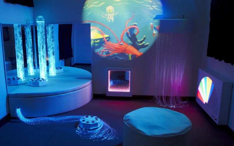 L’atelier se déroule dans l’obscurité, avec des lumières douces de différentes couleurs, créant une atmosphère propice à la détente. L’enfant peut ainsi observer, toucher, se coucher, ou simplement se détendre en toute tranquillité. Des objets sensoriels comme des foulards et des balles sont mis à disposition pour stimuler ses sens de manière douce.
